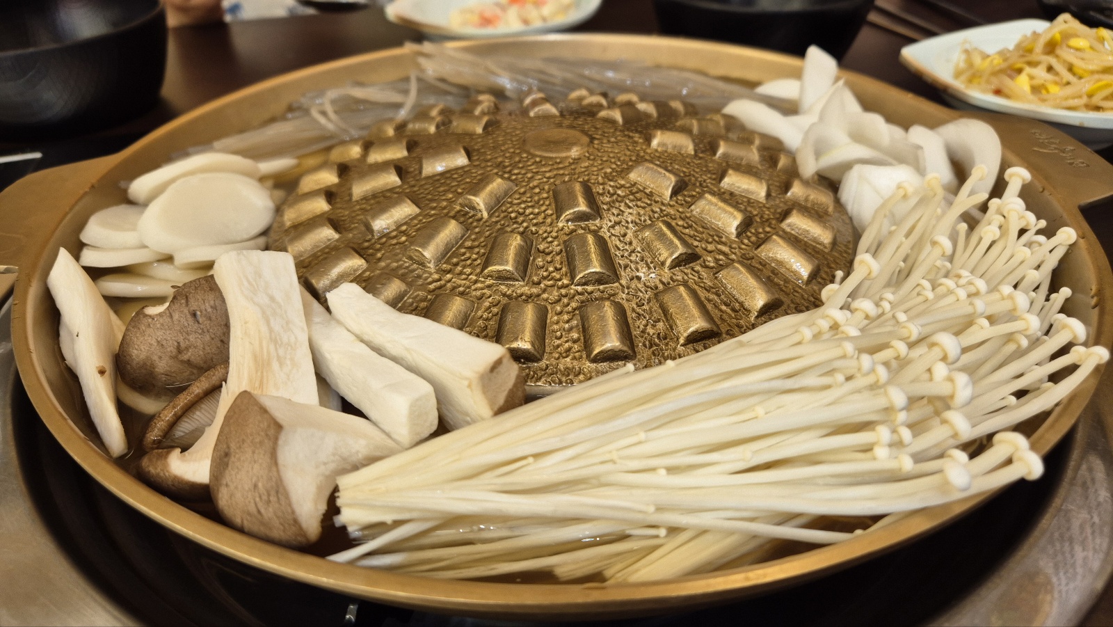 테두리에는 버섯과 떡, 당면사리가 놓여져있고 육수가 부어져 있었습니다.