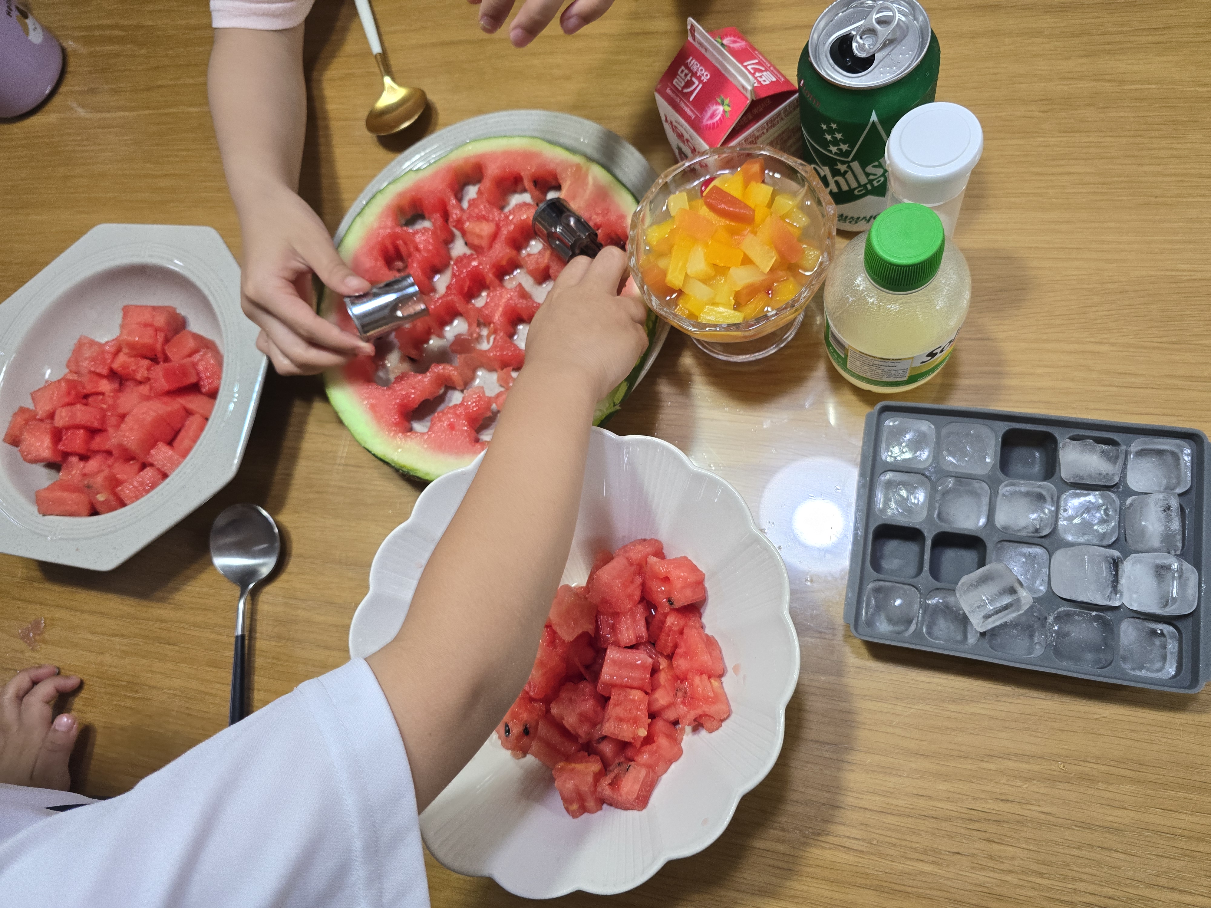 1. 수박은 깍둑썰기해서 준비하거나 모양틀이 있으면 찍어서 예쁜 모양을 만들어줍니다.